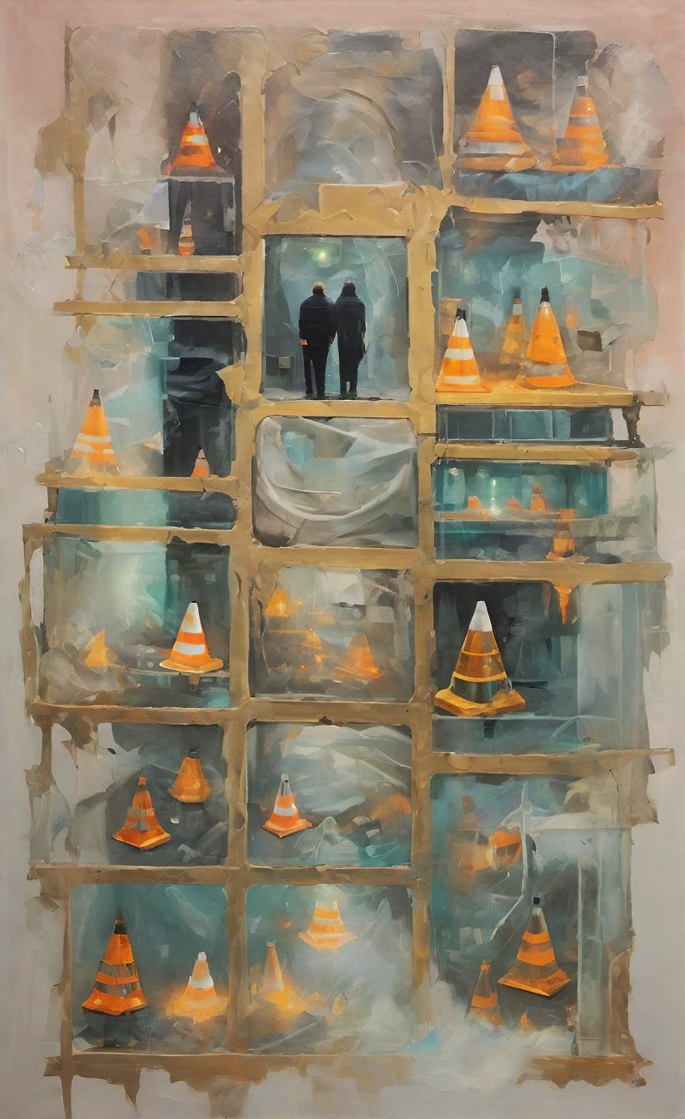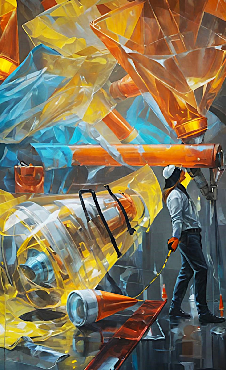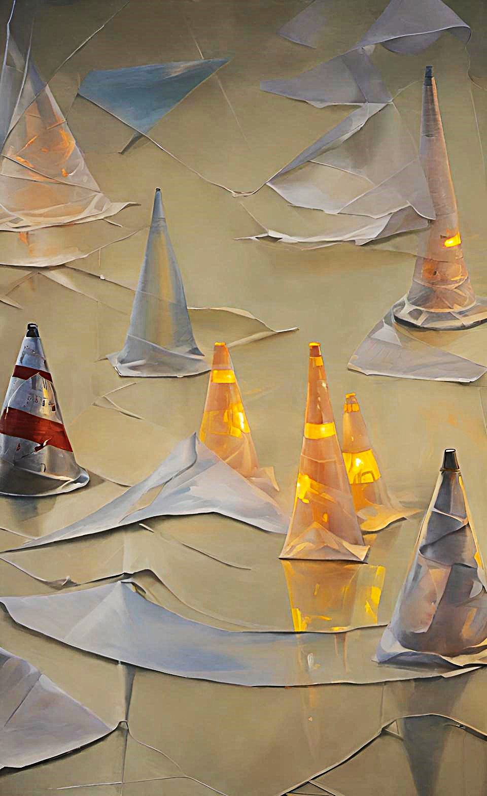 Sergide yer alan eserler, modern bireyin sınırlandırılmış varlığını, yapay düzenlerin ve yüzeysel bilgi sistemlerinin yarattığı dejenerasyonu ortaya koyar. Öne çıkan trafik konileri, bir yandan düzen ve kontrolün sembolü olarak tanıdık bir anlam taşırken, diğer yandan bireyin hem fiziksel hem zihinsel olarak sınırlandırılmasının metaforuna dönüşür. Bu nesneler, gerçekliğin yerini alan yapay bir dünyanın sınırlarını çizen soyut imgeler haline gelir.