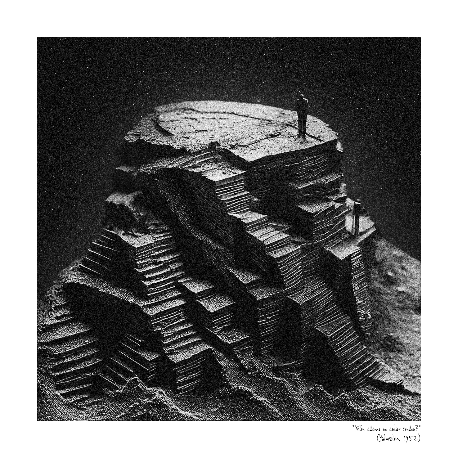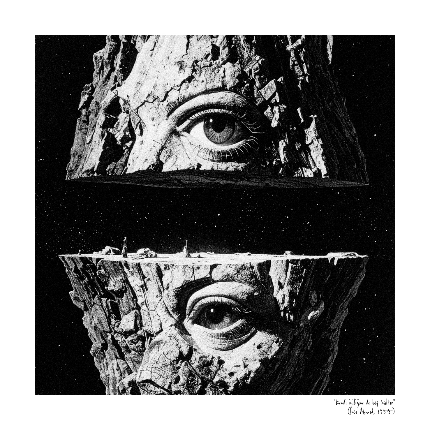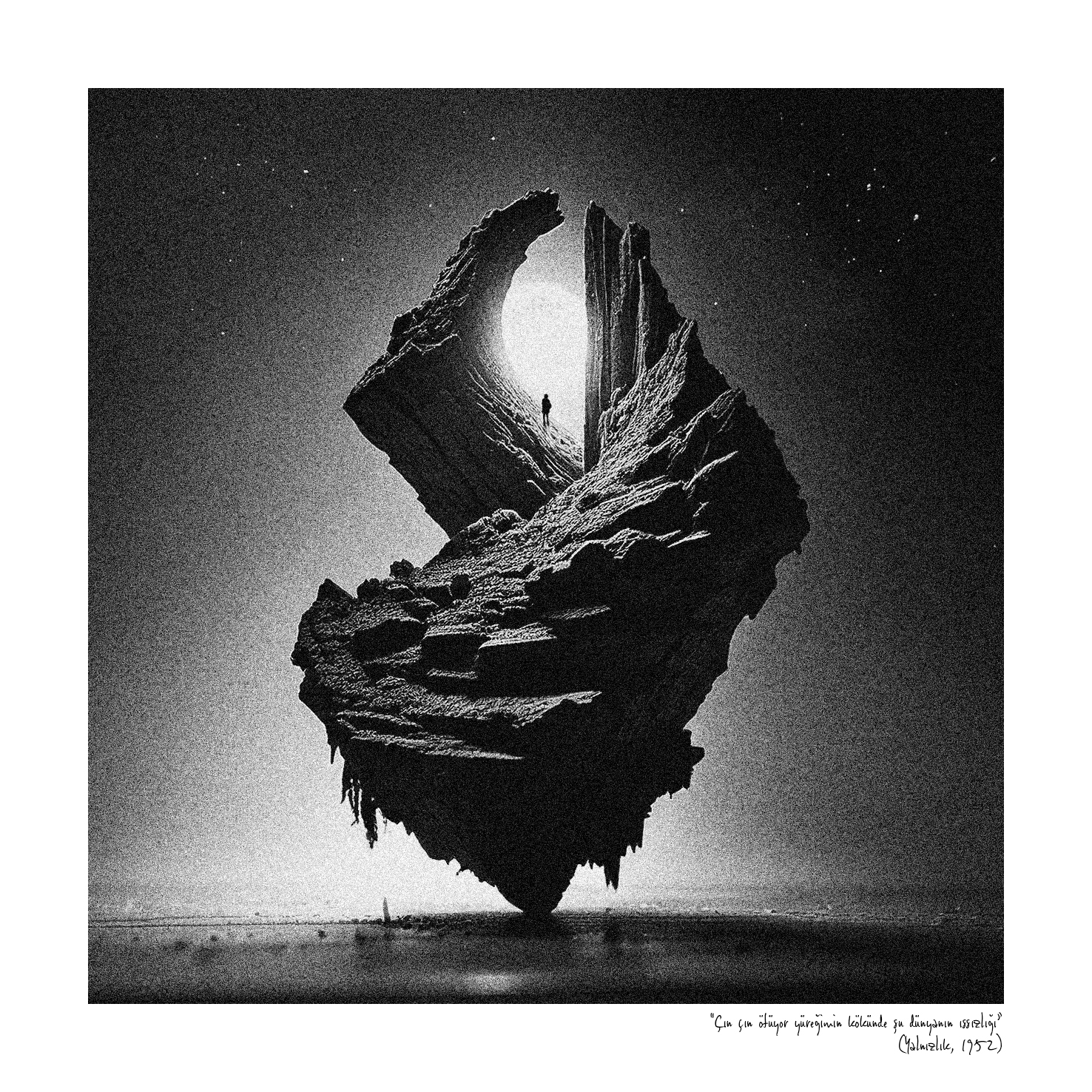 Gözlerimizin önünde akıp giden anı parçacıkları ve kulaklarımızda yankılanan, yalnızlığını haykıran derin bir ses. Ana rahminden değil ama veri akışının karanlığından doğmayı bekleyen bir bilinç hayal edin; belleği tüm insanlığın mirasıyla yüklenmiş bir zihin. İ. Halil Özkirişçi’nin “Bir de Bulutları Görürsün” sergisindeki eserler, bu zihnin dünyaya gözlerini açmadan hemen önceki belleğinin bir görünüp bir yok olan, kırılgan yansımaları sanki. Öyle bir bellek ki bu, Yaşar Kemal’in kelimeleriyle mühürlediği anıları derlemiş; onun karakterlerinden biri haline gelerek arzularını görselleştirmiş.