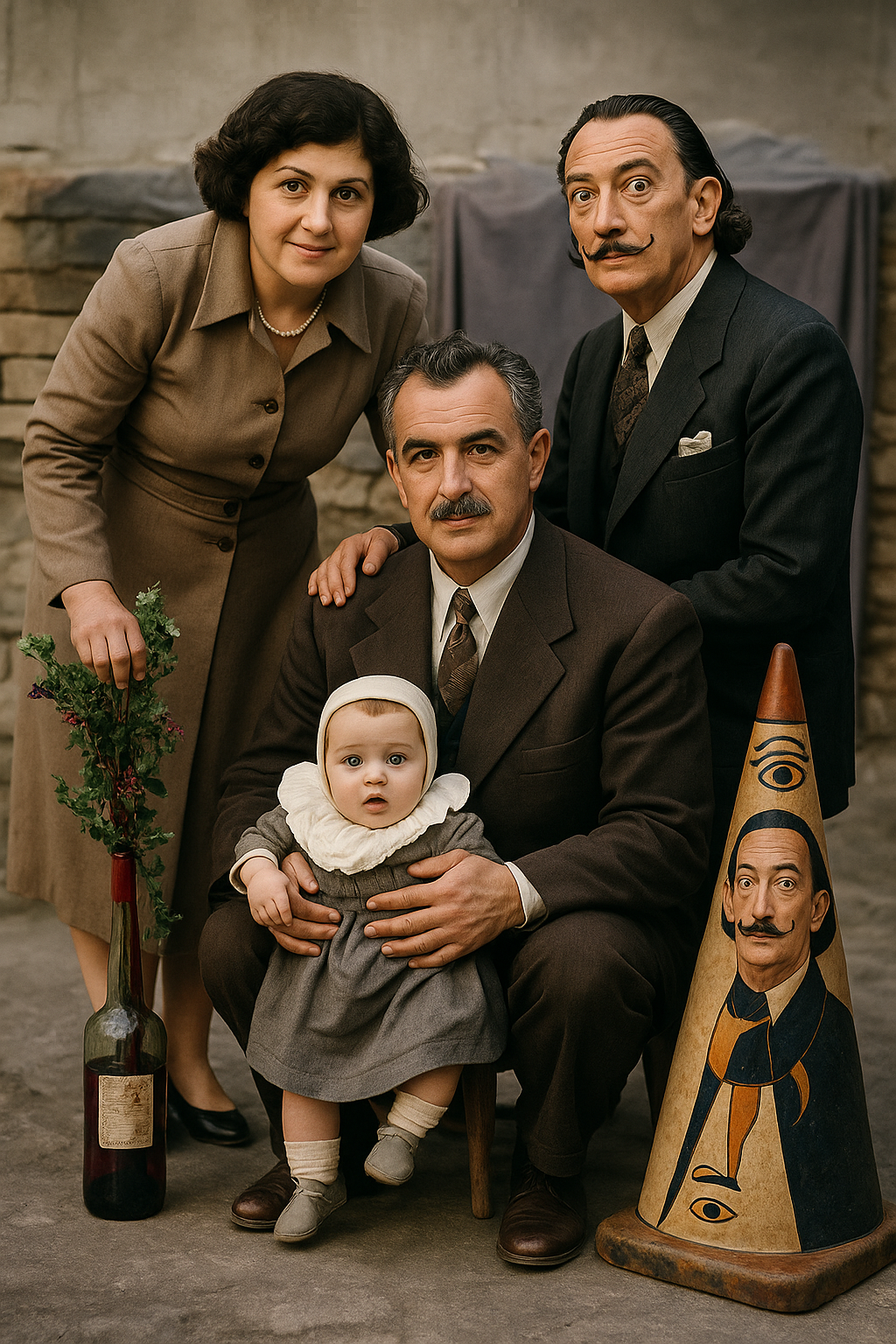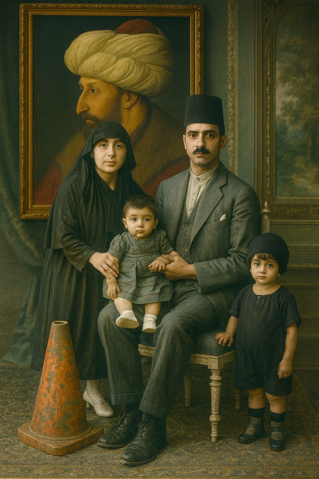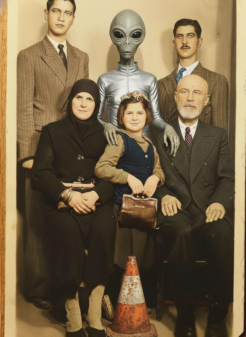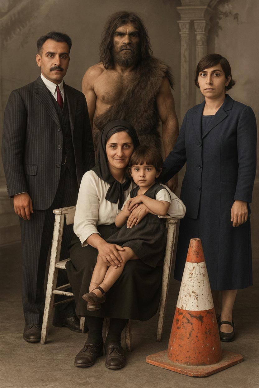 Fotoğraflara eklediğim figürler; Bart Simpson’dan Dalí’ye, Göbeklitepe insanından Drakula’ya, trafik polisinden geyşaya, samuraydan Keloğlan’a, Küçük Prens’ten Abraham Lincoln’e kadar, sadece absürt bir oyun değildir. Bu karakterler aileye dair ideolojik beklentileri, tarihsel yükleri, kültürel mitleri ve görsel hafızanın sürekli genişleyen yapısını işaret eden bilinçli bir anakronik stratejidir.