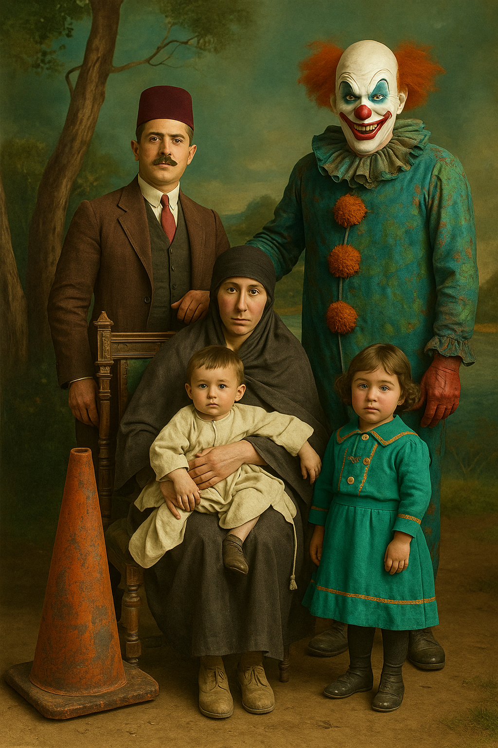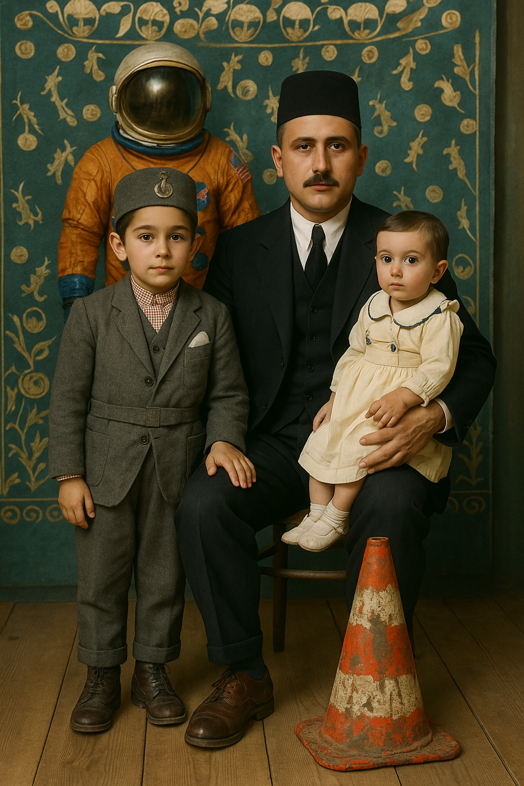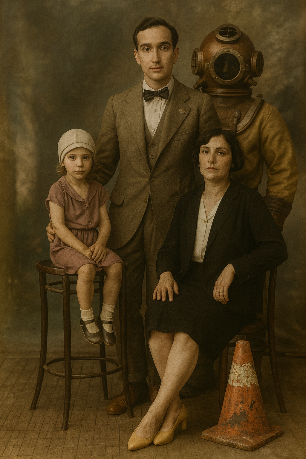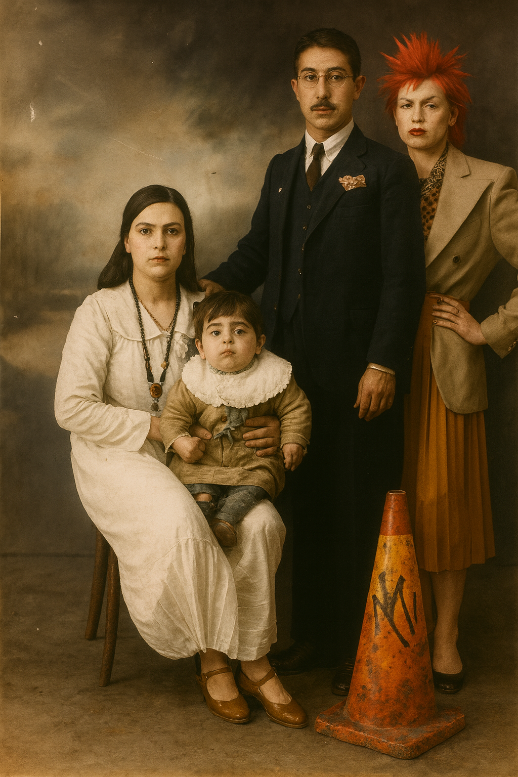 One of the most distinctive elements of the exhibition is the absurd figures the artist places into the photographs. These are not merely aesthetic games or humorous elements; they are symbolic ruptures that dissolve the invisible structure of family ideology. The traffic cone appears here as a powerful metaphor representing the disciplinary order of modernity, its warning systems, and its normative boundaries. The repetition of this object in every photograph makes visible the internal laws that regulate the family and the control mechanisms of modern society. Other figures—divers, butchers, fantastic creatures—remind us of how the body, identity, and belonging are redefined in a post-humanist context. The family is no longer a biological unity but a field of representation constructed through imagistic and technological ties.