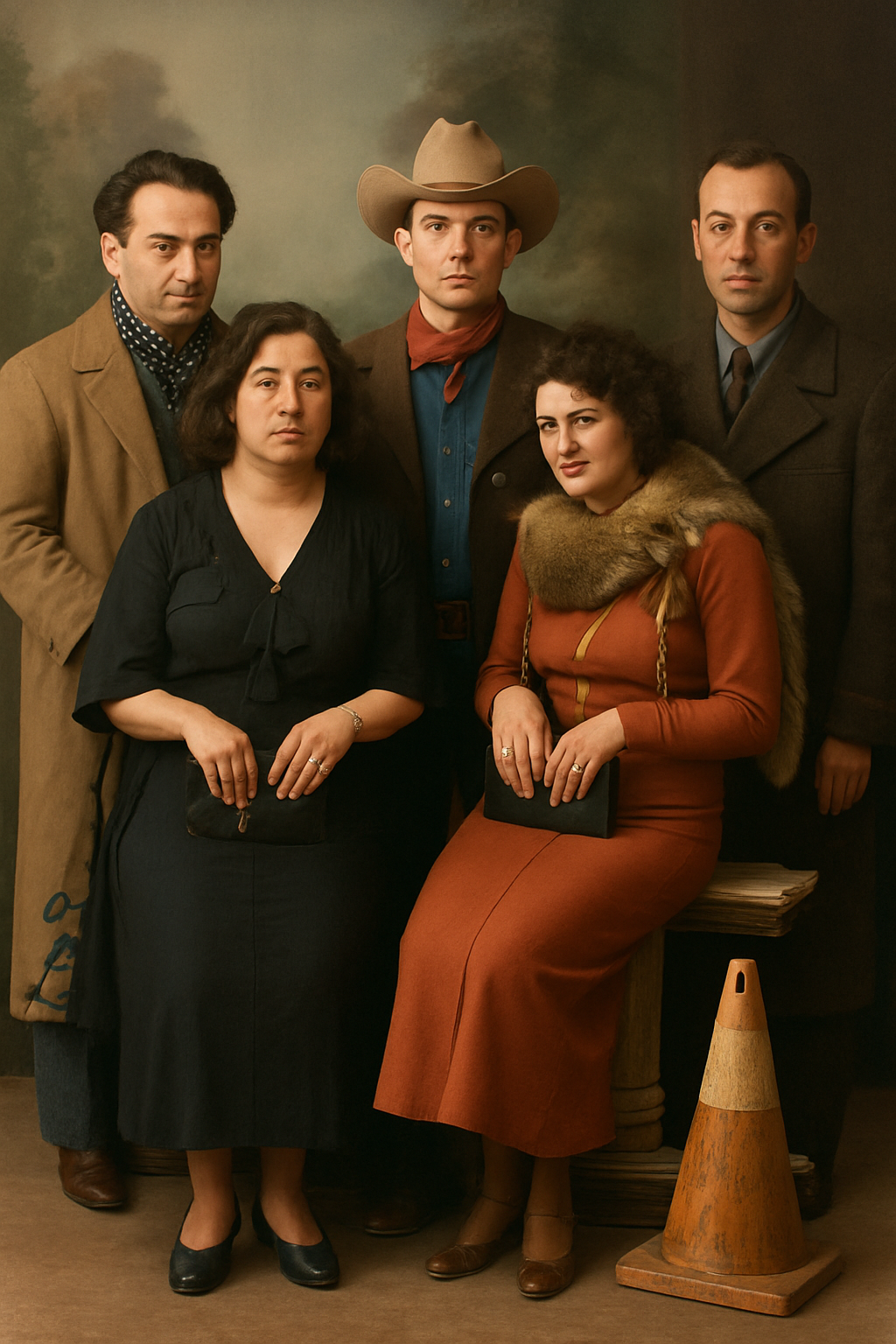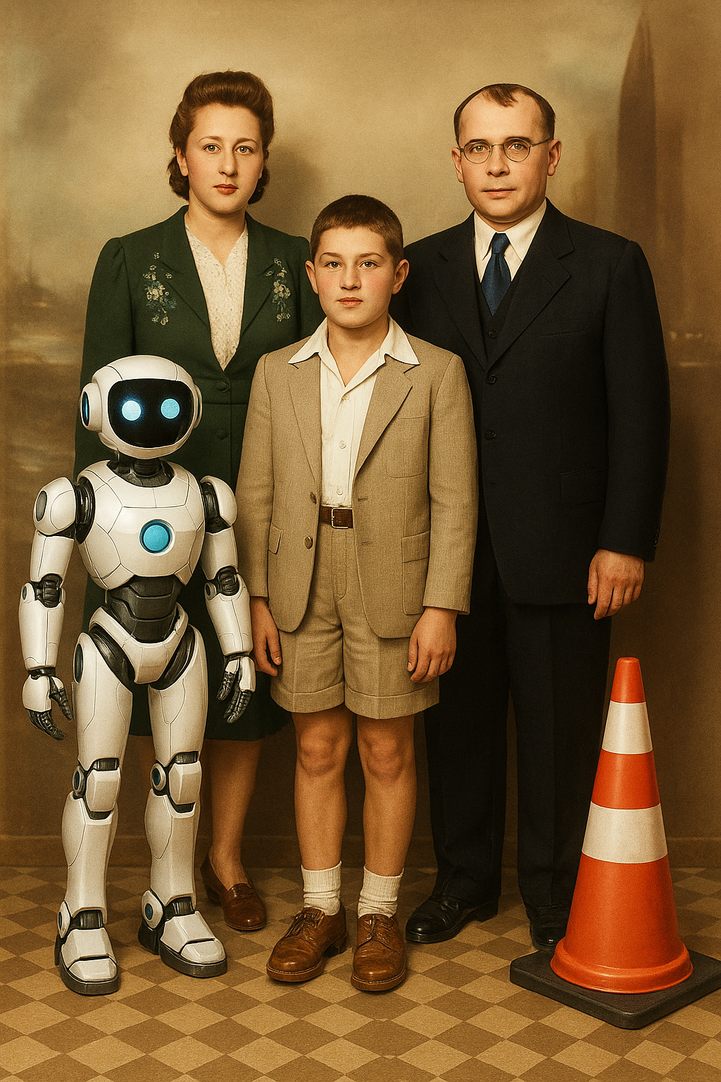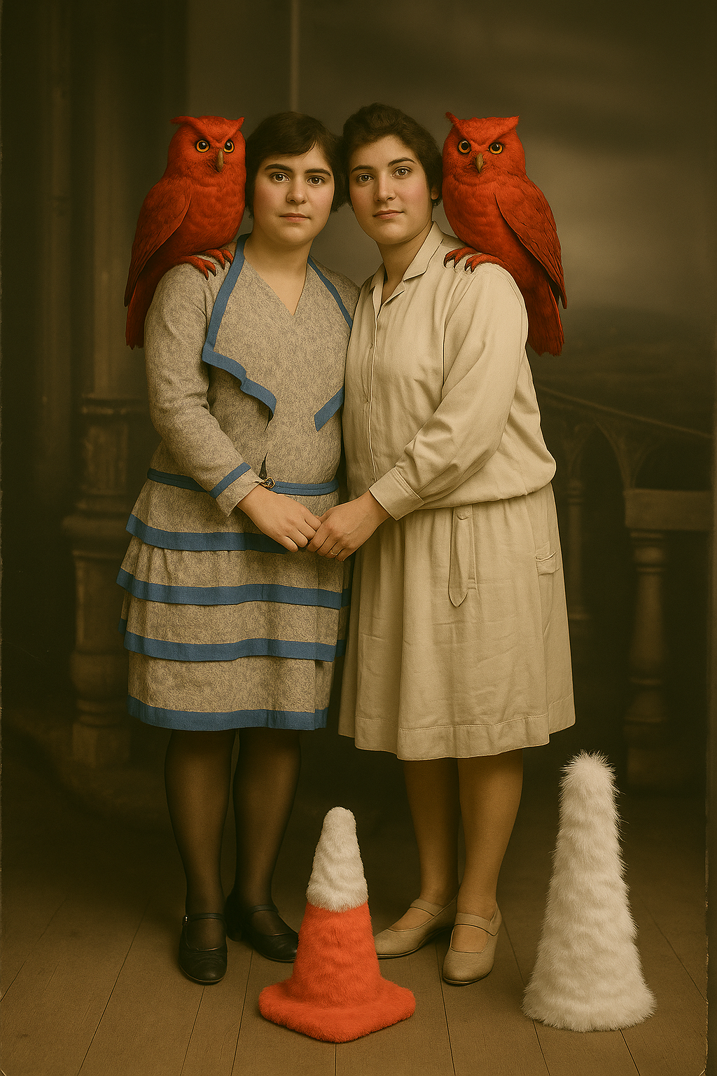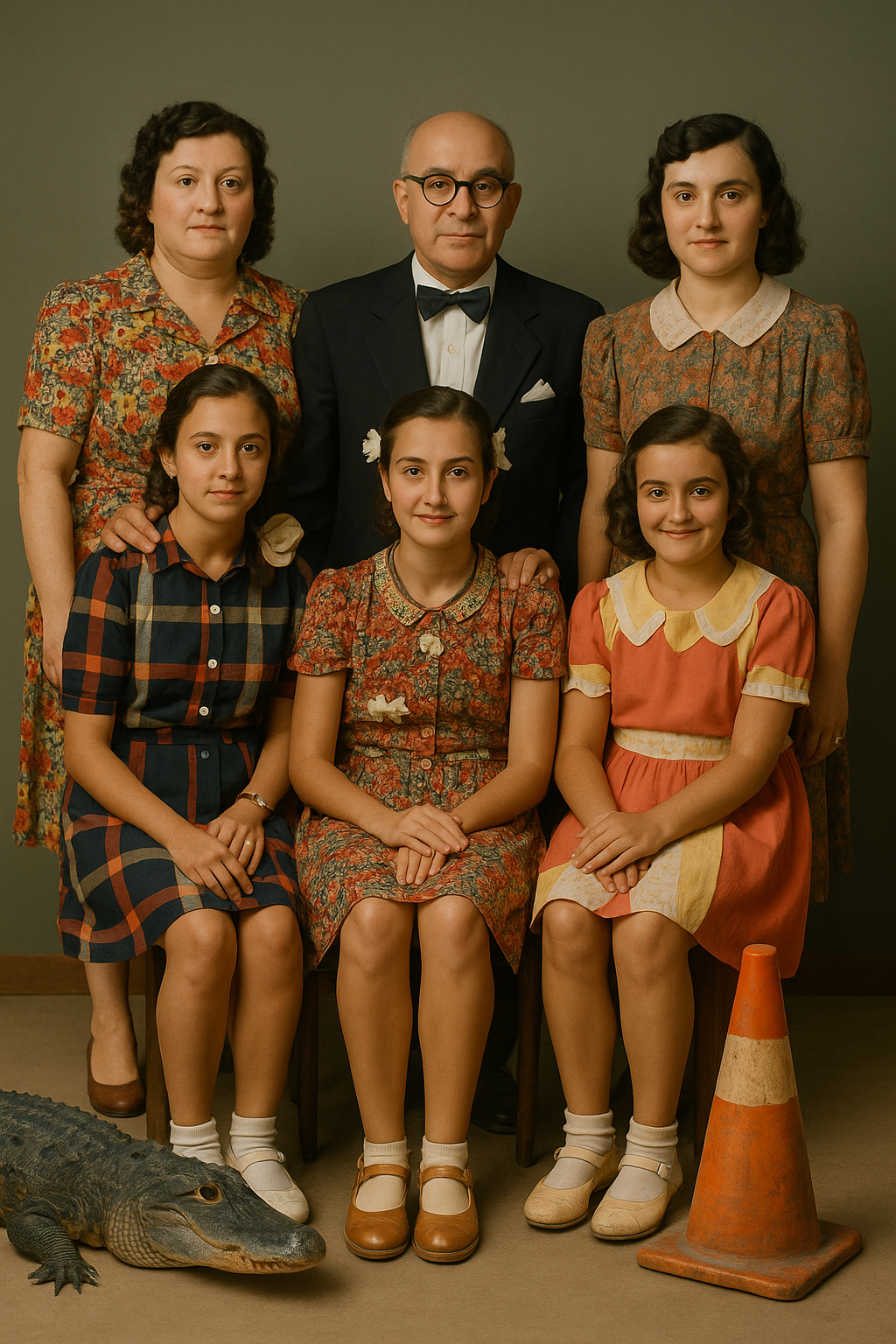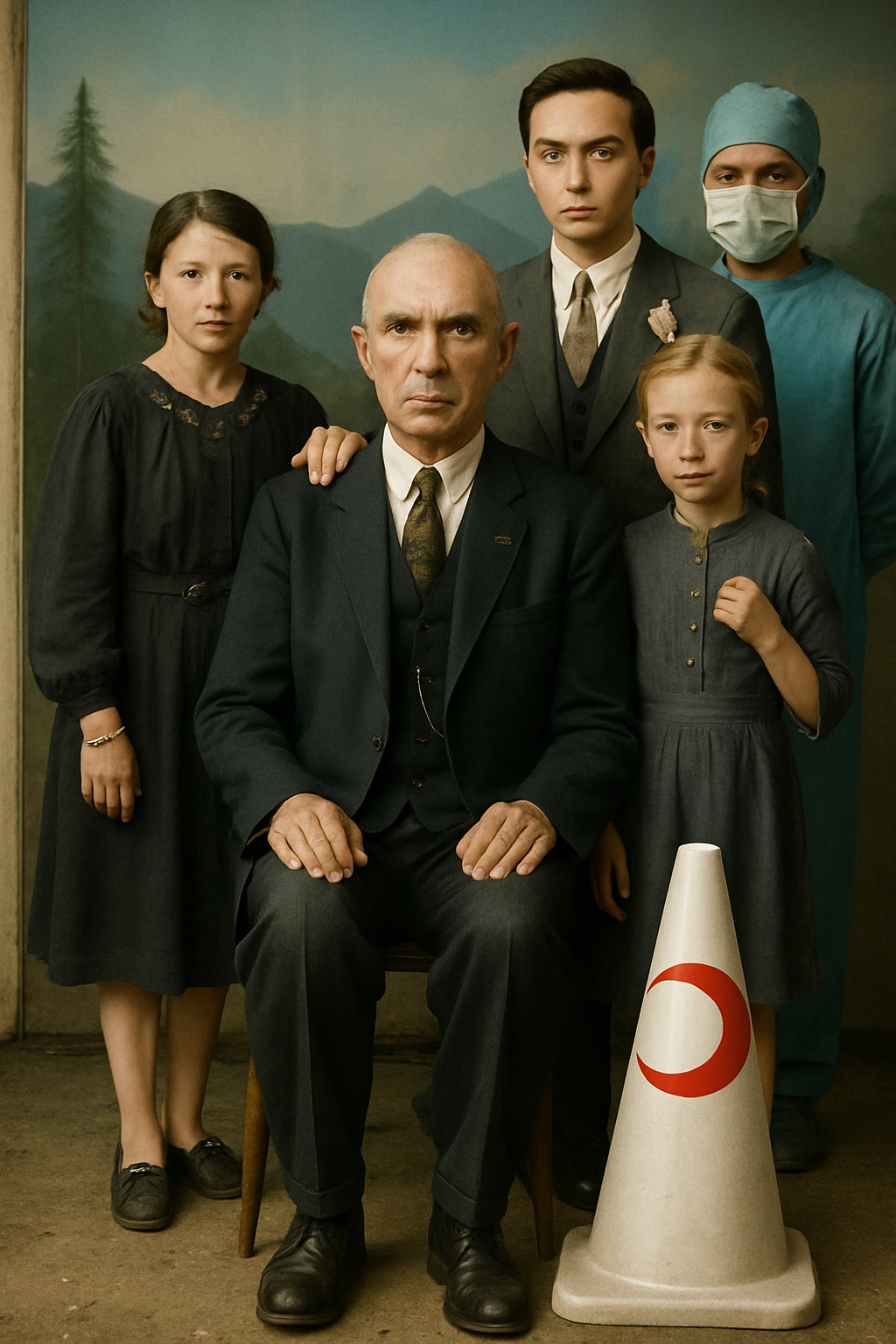 One of the most distinctive elements of the exhibition is the absurd figures the artist places into the photographs. These are not merely aesthetic games or humorous elements; they are symbolic ruptures that dissolve the invisible structure of family ideology. The traffic cone appears here as a powerful metaphor representing the disciplinary order of modernity, its warning systems, and its normative boundaries. The repetition of this object in every photograph makes visible the internal laws that regulate the family and the control mechanisms of modern society. Other figures—divers, butchers, fantastic creatures—remind us of how the body, identity, and belonging are redefined in a post-humanist context. The family is no longer a biological unity but a field of representation constructed through imagistic and technological ties.
